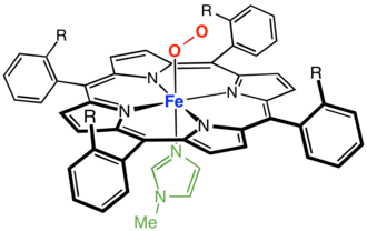 Many models of myoglobin have been synthesized as part of a broad interest in transition metal dioxygen complexes. A well known example is the picket fence porphyrin, which consists of a ferrous complex of a sterically bulky derivative of tetraphenylporphyrin.[38] In the presence of an imidazole ligand, this ferrous complex reversibly binds O2. The O2 substrate adopts a bent geometry, occupying the sixth position of the iron center. A key property of this model is the slow formation of the μ-oxo dimer, which is an inactive diferric state. In nature, such deactivation pathways are suppressed by protein matrix that prevents close approach of the Fe-porphyrin assemblies.[39]