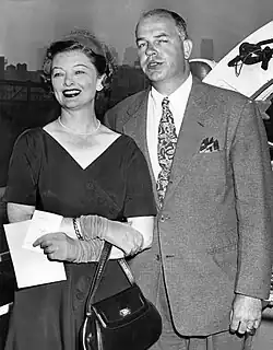 With the outbreak of World War II the same year, Loy all but abandoned her acting career to focus on the war effort and began devoting her time to working with the Red Cross.[50] She was so fiercely outspoken against Adolf Hitler that her name appeared on his blacklist, resulting in her films being banned in Germany.[51] She also helped run a Naval Auxiliary canteen and toured frequently to raise funds for the war efforts. Around 1945, Loy began dating producer and screenwriter Gene Markey, who had previously been married to actresses Joan Bennett and Hedy Lamarr.[48] The two were married in a private ceremony on January 3, 1946, at the chapel on Terminal Island, while Markey was serving in the military.[48]