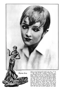 While Loy was dancing in prologues at the Grauman's Egyptian Theatre, portrait photographer Henry Waxman took several pictures of her that were noticed by Rudolph Valentino when the actor went to Waxman's studio for a sitting.[33] Valentino was looking for a leading lady for Cobra, the first independent project he and his wife Natacha Rambova were producing.[34] Loy tested for the role, which went to Gertrude Olmstead instead, but soon after that she was hired as an extra for Pretty Ladies (1925), in which she and fellow newcomer Joan Crawford were among a bevy of chorus girls dangling from an elaborate chandelier. The two of them would share a life-long friendship that would last until Crawford's death.[35]