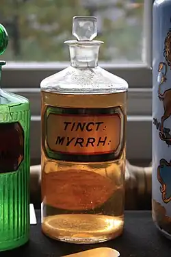 In pharmacology, myrrh has been used as an antiseptic in mouthwashes, gargles, and toothpastes.[6] It has also been used in liniments and salves applied to abrasions and other minor skin ailments. Myrrh has been used as an analgesic for toothache pain and in liniments applied to bruises, aching muscles, and sprains.[7]