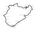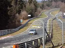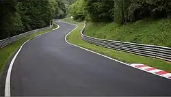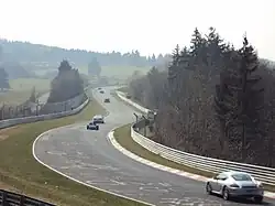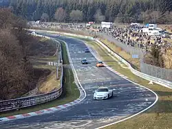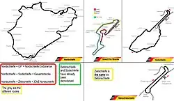 Originally, the track featured four configurations, namely the 28.265 km-long (17.563 mi) Gesamtstrecke,[b] which in turn consisted of the then-22.835 km (14.189 mi) Nordschleife,[a] and the 7.747 km (4.814 mi) Südschleife.[c] There was also a 2.281 km (1.417 mi) warm-up loop called Zielschleife,[d] or Betonschleife,[e] around the pit area.[3] Between 1982 and 1983, the start–finish area was demolished to create a new GP-Strecke,[f] which is now used for all major and international racing events. However, the shortened Nordschleife is still in use for racing, testing and public access.[4]