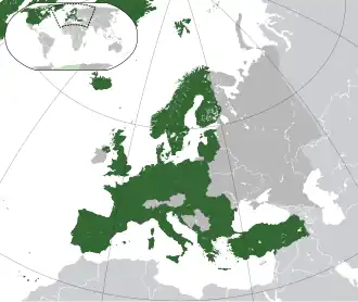 NATO has thirty-two members, mostly in Europe with two in North America. NATO's "area of responsibility", within which attacks on member states are eligible for an Article 5 response, is defined under Article 6 of the North Atlantic Treaty to include member territory in Europe, North America, Turkey, and islands in the North Atlantic north of the Tropic of Cancer. Attacks on vessels, aircraft and other forces in the North Atlantic (again, north of the Tropic of Cancer) and the Mediterranean Sea may also provoke an Article 5 response.[118] During the original treaty negotiations, the United States insisted that colonies such as the Belgian Congo be excluded from the treaty.[119][120] French Algeria was, however, covered until its independence on 3 July 1962.[121] Twelve of these thirty-two are original members who joined in 1949, while the other twenty joined in one of ten enlargement rounds.[122]