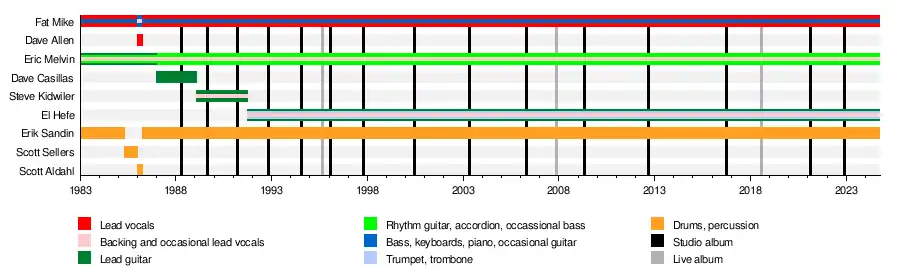 NOFX (/ˌnɛfˈɛks/) was an American punk rock band formed in Los Angeles in 1983.[1] Bassist/lead vocalist Fat Mike, rhythm guitarist Eric Melvin and drummer Erik Sandin were original founding and longest-serving members of the band, who have appeared on every release by the band, although Sandin had departed briefly in 1985, only to rejoin the following year.[1] El Hefe joined the band in 1991 to play lead guitar and trumpet, rounding out the best-known iteration of the lineup.