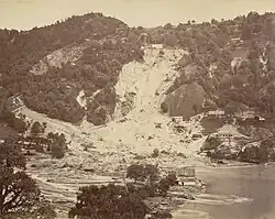 Landslides are a frequent occurrence in the hill slopes surrounding the lake, which are steep. The slopes are highly vulnerable to landslides and mass movement due to various geological and human factors. The first known landslip occurred in Nainital in 1866 on Alma hill, and in 1879 there was a larger one at the same spot. The greatest landslide in Nainital occurred on 18 September 1880, on the slope which rising from the north of the flats ends at Alma peak, and resulted in 151 people being buried under the debris.[22] Another heavy landslip occurred on 17 August 1898 outside the Nainital valley.[23]