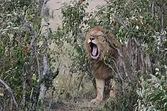 The park has a large and diverse wildlife population.[3] Species found in the park include lion, leopard, African buffalo, black rhinoceros, giraffe, hippopotamus, spotted hyena, African bush elephant, blue wildebeest, plains zebra, cheetah, Thomson's gazelle, Grant's gazelle, common eland, impala, hartebeest, waterbuck, common warthog, olive baboon, black-backed jackal, common ostrich, and Nile crocodile.[11][13]
