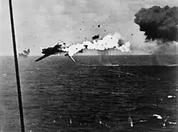On 5 November fourteen B6N1s, escorted by four A6M Zero fighters, were sent to attack American shipping anchored off Bougainville. Four B6N1s were lost and no hits were scored, returning Japanese pilots claimed to have sunk one large and one medium carrier, two heavy cruisers and two other cruisers or large destroyers.[9]