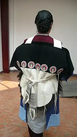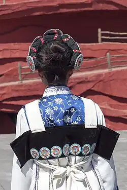 The Nakhi women wear wide-sleeved loose gowns accompanied by jackets and long trousers, tied with richly decorated belts at the waist. Sheepskin is worn over the shoulder. Especially in Ninglang County, the women wear short jackets and long skirts reaching the ground with several folds. Large black cotton turbans are worn around their heads, which are accompanied with big silver earrings. The men's costume is much like that of Han Chinese. In modern times, traditional dress is rarely worn among the younger generation. It is now usually only worn at cultural events and on special occasions.