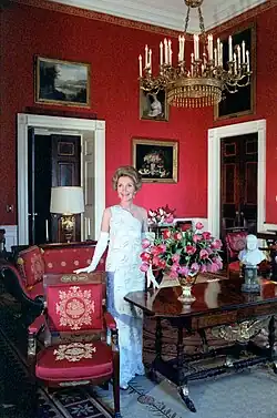 The First Lady secured the assistance of renowned interior designer Ted Graber, popular with affluent West Coast social figures, to redecorate the family living quarters.[76] A Chinese-pattern, handpainted wallpaper was added to the master bedroom.[77] Family furniture was placed in the president's private study.[76] The first lady and her designer retrieved several White House antiques, which had been in storage, and placed them throughout the mansion.[76] In addition, many of Reagan's collectibles were put out for display, including around twenty-five Limoges Boxes, as well as some porcelain eggs and a collection of plates.[78]