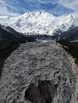 To the south, Nanga Parbat has what is often referred to as the highest mountain face in the world: the Rupal Face rises 4,600 m (15,090 ft) above its base.[16] To the north, the complex, somewhat more gently sloped Rakhiot Flank rises 7,000 m (23,000 ft) from the Indus River valley to the summit in just 25 km (16 mi), one of the ten greatest elevation gains in such a short distance on Earth.[17]