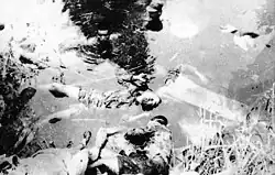 A Japanese soldier (lower right corner) with the corpses of Chinese civilians (centre) by the Qinhuai River (upper left corner)