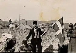 Bernhard Sindberg holding a Danish flag with Chinese refugees in his refugee camp.