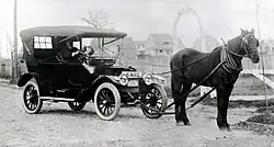 Clinton Folger, mail carrier for Nantucket, towed his car to the state highway for driving to Siasconset, in observance of an early 20th-century ban on automobiles on town roads.