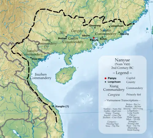 Nanyue (Chinese: 南越[1] or 南粵[2]; pinyin: Nányuè; Jyutping: Naam4 Jyut6; lit. 'Southern Yue', Vietnamese: Nam Việt, Zhuang: Namz Yied)[3] was an ancient kingdom founded in 204 BC by the Chinese general Zhao Tuo, whose family (known in Vietnamese as the Triệu dynasty) continued to rule until 111 BC.[4][5] Nanyue's geographical expanse covered the modern Chinese subdivisions of Guangdong,[6] Guangxi,[6] Hainan,[7] Hong Kong,[7] Macau,[7] southern Fujian[8] and central to northern Vietnam.[6] Zhao Tuo, then Commander of Nanhai Commandery of the Qin dynasty, established Nanyue in 204 BC after the collapse of the Qin dynasty. At first, it consisted of the commanderies of Nanhai, Guilin, and Xiang.