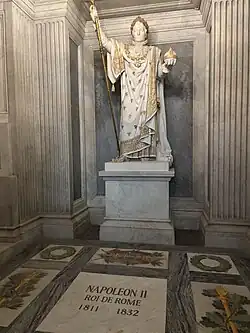 On 15 December 1940, Adolf Hitler ordered the remains of Napoleon II to be transferred from the Imperial Crypt in Vienna to the dome of Les Invalides in Paris.[9][10] The remains of Napoleon I had been returned to France in December 1840, at the time of the July Monarchy.[11] In December 1969, the remains of Napoleon II were moved underground to the cella of Napoleon's tomb.