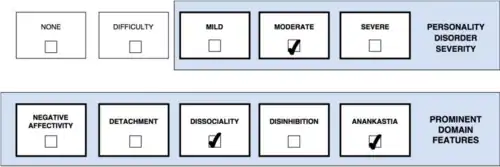 The number of specific PDs was reduced from 10 to 6 (antisocial, avoidant, borderline, narcissistic, obsessive–compulsive, and schizotypal) as well as a diagnosis of "personality disorder—trait specified" that can be made when criteria for a specific disorder are not met, but a personality disorder is assessed as present [23].