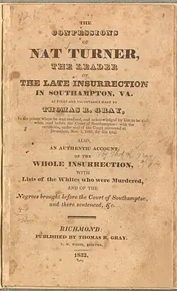 - ^ a b Gray, Thomas Ruffin (1831). The Confessions of Nat Turner, the Leader of the Late Insurrections in Southampton, Va. Baltimore, Maryland: Lucas & Deaver, p. 9.