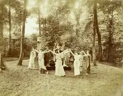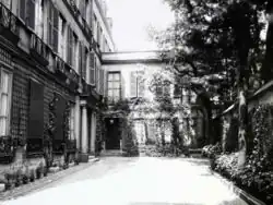 In the 1900s Barney held early gatherings of the salon at her house in Neuilly. The entertainment included poetry readings and theatricals (in which Colette sometimes performed). Mata Hari performed a dance once, riding into the garden naked as Lady Godiva on a white horse harnessed with turquoise cloisonné.[79] The play Equivoque may have led Barney to leave Neuilly in 1909. According to a contemporary newspaper article, her landlord objected to her holding an outdoor performance of a play about Sappho, which he felt "followed nature too closely".[80] She canceled her lease and rented the pavilion on Rue Jacob in Paris's Latin Quarter, and her salon was held there until the late 1960s. This was a small two-story house, separated on three sides from the main building on the street. Next to the pavilion was a large, overgrown garden with a Doric "Temple of Friendship" tucked into one corner. In this new location, the salon grew a more prim outward face, with poetry readings and conversation, perhaps because Barney had been told the pavilion's floors would not hold up to large dancing parties.[81][82] Frequent guests during this period included poets Pierre Louÿs and Paul Claudel, diplomat Philippe Berthelot and translator J. C. Mardrus.[83]