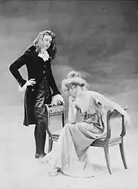 In 1899, after seeing the courtesan Liane de Pougy at a dance hall in Paris, Barney presented herself at de Pougy's residence in a page costume and announced she was a "page of love" sent by Sappho.[21] Although de Pougy was one of the most famous women in France, constantly sought after by wealthy and titled men, Barney's audacity charmed her.[22]