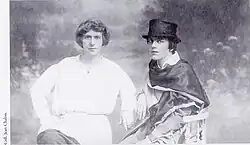 In November 1899, Barney met the poet Pauline Tarn, better known by her pen name Renée Vivien. For Vivien it was love at first sight, while Barney became fascinated with Vivien after hearing her recite one of her poems,[35] which Barney described as "haunted by the desire for death".[36] Their romantic relationship was also a creative exchange that inspired both of them to write. Barney provided a feminist theoretical framework which Vivien explored in her poetry. They adapted the imagery of the Symbolist poets along with the conventions of courtly love to describe love between women, also finding examples of heroic women in history and myth.[37] Sappho was an especially important influence and they studied Greek so as to read the surviving fragments of her poetry in the original. Both wrote plays about her life.[38]