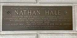 The Yale Club bears a plaque hung by the Daughters of the American Revolution which states the event occurred "near" the Club.[26] Yale is Hale's alma mater and the Club is at 44th Street and Vanderbilt Avenue, mere feet from Grand Central Terminal. Another account places Hale's execution at Bergen Beach, Brooklyn, but there is no evidence to support this claim.[27]
