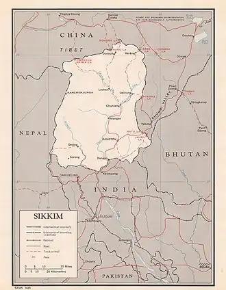 In 1936–37, a diplomatic British delegation to Lhasa including B. J. Gould and F. S. Chapman used the Nathu La pass.[34][35] Chapman writes that during their journey from Gangtok to Nathu la, just at the foot of the pass, was a road leading to the right and a signbord indicating Kupup.[36] This route would have put them onto the Kalimpong-Lhasa route via Jelep La.[36] Chapman writes that "From Gangtok the mule-track starts for the Natu La, and from Kalimpong the longer and more difficult road leaves for the Jelep La. By these two passes the road from Lhasa crosses the main range of the Himalaya on its way to India..."[37] Chapman goes on to write that from the summit of the pass, if it were not for the mist, the delegation would have been able to see Chomolhari.[38] At the summit, Chapman writes of groups of stones and prayer flags these were not only for the protection of travelers, but they marked the boundary between Sikkim and Tibet.[38] The road near the pass was paved with stones.[38] The first stop after the pass was Champithang,[38] a resting place for the British on the way to Lhasa.[39]