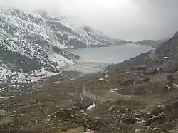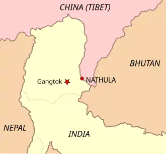 Nathu La is a mountain pass on the Dongkya Range that separates Sikkim and the Chumbi Valley at an elevation of 14,250 feet (4,340 m).[19][b] The pass is 52–54 kilometres (32–34 mi) east of Gangtok, the capital of Sikkim,[21][20] and 35 kilometres (22 mi) from Yatung Shasima, the headquarters of the Yadong County (or the Chumbi Valley).[22]