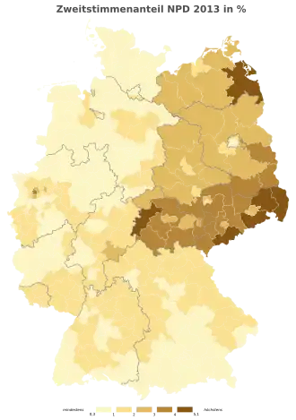 In the 2005 federal elections, the NPD received 1.6 percent of the vote nationally. It garnered the highest percent of votes in the states of Saxony (4.9 percent), Thuringia (3.7 percent), Mecklenburg-Vorpommern (3.5 percent) and Brandenburg (3.2 percent), all formerly part of East Germany. In most other states, the party won around 1 percent of the total votes cast. In the 2006 Mecklenburg-Vorpommern state election, the NPD received 7.3% of the vote and thus achieved state representation there, as well.[53]