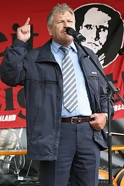 Since its founding in 1964, the party has never managed to win enough votes on the federal level to cross Germany's 5% minimum threshold for representation in the Bundestag; it has succeeded in crossing the 5% threshold and gaining representation in state parliaments 11 times, including one-convocation entry to seven West German state parliaments between November 1966 and April 1968 and two-convocation electoral success in two East German states of Saxony and Mecklenburg-Vorpommern between 2004 and 2011.[23] Since 2016, The Homeland has not been represented in state parliaments. Udo Voigt led the NPD from 1996 to 2011.[21] He was succeeded by Holger Apfel,[24] who in turn was replaced by Udo Pastörs in December 2013. In November 2014, Pastörs was ousted and Frank Franz became the party's leader. Voigt was elected the party's first Member of the European Parliament in 2014. The party lost the seat in the 2019 European Parliament election. In June 2023, the party renamed itself to Die Heimat after a party vote.[25][26]