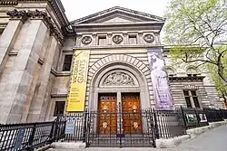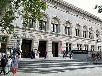 For the first 40 years, the gallery was housed in various locations in London. The first 13 years were spent at 29 Great George Street, Westminster. There, the collection increased in size from 57 to 208 items, and the number of visitors from 5,300 to 34,500. In 1869, the collection moved to Exhibition Road and buildings managed by the Royal Horticultural Society. Following a fire in those buildings, the collection was moved in 1885, this time to the Bethnal Green Museum. This location was ultimately unsuitable due to its distance from the West End, condensation and lack of waterproofing. Following calls for a new location to be found, the government accepted an offer of funds from the philanthropist William Henry Alexander. Alexander donated £60,000 followed by another £20,000, and also chose the architect, Ewan Christian. The government provided the new site on St Martin's Place, adjacent to the National Gallery, and £16,000.[7] The buildings, faced in Portland stone, were constructed by Shillitoe & Son.[8] Both the architect, Ewan Christian, and the gallery's first director, George Scharf, died shortly before the new building was completed. The gallery opened at its new location on 4 April 1896.[7] The first extension, in 1933, was funded by Lord Duveen, and resulted in the wing by the architect Sir Richard Allison[9] on a site previously occupied by St George's Barracks running along Orange Street.[10]