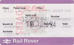 The most common types of tickets available include 'advance' tickets, that specify a specific route and timing between two destinations, 'off-peak' tickets, either as a single or a return, that allow a passenger to use a train at hours where the service is not busy, and 'anytime' tickets, which can be used on any train. Season tickets, which offer unlimited travel between two stations for a specified period, are also available.[12] A 'rover' travel card ticket also exists that allows unlimited travel in a set area or on services of certain operators, for a certain period of time. Rovers which allow unlimited travel for only one day are sometimes referred to as ranger tickets, and are usually available for smaller areas.[13]