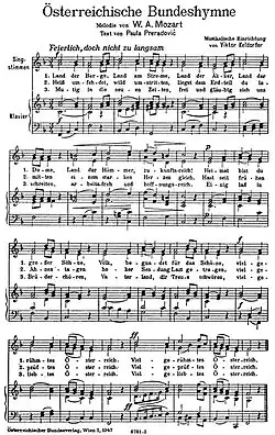 The National Anthem of Austria (Austrian German: Bundeshymne der Republik Österreich, lit. 'Federal Hymn of [the] Republic [of] Austria'), also known by its incipit "Land der Berge, Land am Strome" (pronounced [lant deːɐ̯ ˈbɛʁɡə lant ʔam ˈʃtʁoːmə]; 'Land of the Peaks, Land by the Stream'), was adopted without lyrics in 1946. The melody, which at that time was incorrectly attributed to Wolfgang Amadeus Mozart, was matched with a text by Paula von Preradović the following year.