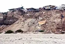 Coastal erosion is a physical process by which shorelines in coastal areas around the world shift and change, primarily in response to waves and currents that can be influenced by tides and storm surge.[56] Coastal erosion can result from long-term processes (see also beach evolution) as well as from episodic events such as tropical cyclones or other severe storm events. Coastal erosion is one of the most significant coastal hazards. It forms a threat to infrastructure, capital assets and property.
