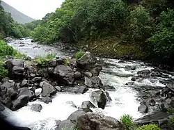 A river is a natural watercourse,[7] usually freshwater, flowing toward an ocean, a lake, a sea or another river. A few rivers simply flow into the ground and dry up completely without reaching another body of water.