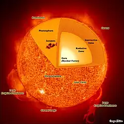 Earth has evolved through geological and biological processes that have left few traces of the original conditions.[13] The outer surface is divided into several gradually migrating tectonic plates.[14] The interior remains active, with a thick layer of plastic mantle and an iron-filled core that generates a magnetic field. This iron core is composed of a solid inner phase, and a fluid outer phase. Convective motion in the outer core generates electric currents through dynamo action, and these, in turn, generate the geomagnetic field.[15]