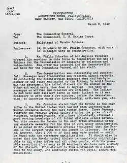Robert W. Young and William Morgan, who both worked for the Navajo Agency of the Bureau of Indian Affairs, developed and published a practical orthography in 1937. It helped spread education among Navajo speakers.[30] In 1943 the men collaborated on The Navajo Language, a dictionary organized by the roots of the language.[31] In World War II, the United States military used speakers of Navajo as code talkers—to transmit top-secret military messages over telephone and radio in a code based on Navajo. The language was considered ideal because of its grammar, which differs strongly from that of German and Japanese, and because no published Navajo dictionaries existed at the time.[32]