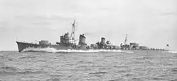 Cushing, having recovered from her near collision, fired her guns at Amatsukaze and attempted to sink her. However, her shots were badly aimed and failed to damage their target.[45] In turn, Cushing was ambushed by Yukikaze and Teruzuki which fired their guns at a mere 3,000 yards. Cushing attempted to turn attention to her attackers, but 5-inch (127 mm) and 3.9-inch (10 cm) shell hits quickly destroyed all electrical and engine power and disabled her guns, fatal damage that led to her being eventually abandoned and left to sink.[50][51] Blasted into a floating wreck by over 20 shell hits and lit up by a massive fire in just one minute, Cushing could only respond with machine gun fire, which managed to kill a sailor on Yukikaze's deck but otherwise caused only cosmetic damage.[52][53][54] As the defenseless Cushing drifted away from the battle, her sailors watched as the massive Hiei sailed right past them.[40][55] In turn, after helping to sink Atlanta, Ikazuchi was fired on by Portland and hit by two 8-inch (203 mm) shells to her bow, starting a small fire and disabling her forward turret.[43]