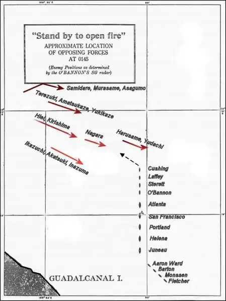 The U.S. ship formation began to fall apart, apparently further delaying Callaghan's order to commence firing as he first tried to ascertain and align his ships' positions.[37] Meanwhile, the two forces' formations began to overlap as individual ship commanders on both sides anxiously awaited permission to open fire.[34]