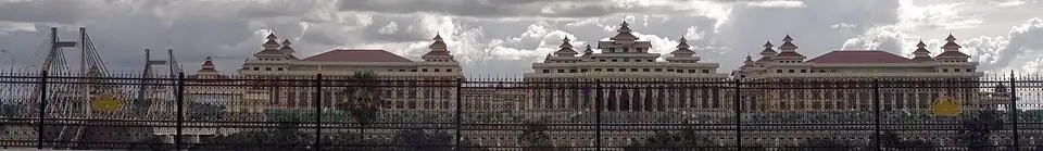 Among the significant structures that were damaged included the Presidential Palace, the Pyidaungsu Hluttaw, the national legislature, and the mansion residences of high-ranking military officials, including Than Shwe, Maung Aye, Thein Sein, and Tin Aye.[19] In mid-April, a Ministry of Construction assessment found that one-third of government staff buildings in nine of Naypyidaw's wards were rendered unhabitable or destroyed.[22] Many government offices, including the Central Bank, and the ministries of foreign affairs, hotels and tourism, immigration and population, and commerce, planned to relocate to Yangon, due to damage to offices and staff housing complexes.[18]