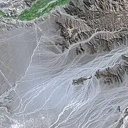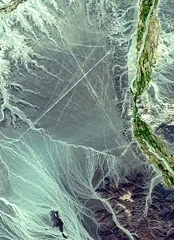 Satellite picture of an area containing lines: north is to the right (coordinates: 14°42′S 75°00′W / 14.7°S 75.°W / -14.7; -75.)
