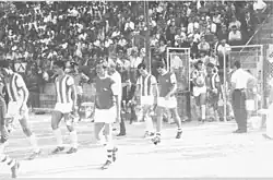 The 1965–66 season was one of the best (but painful) periods for Nea Salamina; the team arguably played the best football in Cyprus.[53] The team contended for the championship until the last game of the season and lose its first cup final.[53] In a game against APOEL at the old GSP stadium, Nea Salamina was leading 3–0. In the 62nd minute, an APOEL player hit a Nea Salamina's player; an APOEL grabbed and hid a linesman's flag. The game was halted, and the CFA ordered a rematch. The dispute lasted more than three weeks; in the meantime Nea Salamina was defeated by the bottommost team, Aris Limassol F.C.[54] In the penultimate match of the tournament Omonia and Salamina were tied for first place on points, and Olympiacos was one point behind.[55] In the game against Olympiakos Nicosia Nea Salamina was leading 2–1, but Olympiakos tied the game in allegedly excessive extra time.[56] After clashes in the last few seconds, the game was halted and ordered replayed.[56] Omonia was in first place with 50 points; Nea Salamina was second with 47 and Olympiakos third with 46. With a victory over Olympiakos Nea Salamina would win the championship, since it had more goals than Omonia. On 31 May 1966 many buses and cars drove from Famagusta to Nicosia, where Nea Salamina was defeated 6–3.[55][56] The best defense in the league, which had allowed fifteen goals in nineteen games, allowed six in one game.[55] For a second time, Nea Salamina finished third. This defeat affected team morale in the cup final with rival Apollon Limassol; although it was favored, the team lost 4–2.[55][57] During this period Salamina had the best defense in the league, with 21 goals in 20 games (a team record).[56]