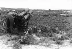 Rocket development had begun during the 1920s and reached fruition in the late thirties. This offered the opportunity for the Nebeltruppen to deliver large quantities of poison gas or smoke simultaneously. The first weapon to be delivered to the troops was the 15 cm Nebelwerfer 41 in 1940, after the Battle of France, a purpose-designed rocket with gas, smoke and high-explosive warheads. It, like virtually all German rocket designs, was spin-stabilized to increase accuracy. One very unusual feature was that the rocket motor was in the front, the exhaust venturi being about two-thirds down the body from the nose, with the intent to optimize the blast effect of the rocket as the warhead would still be above the ground when it detonated. This proved to greatly complicate manufacture for not much extra effect and it was not copied on later rocket designs. It was fired from a six-tube launcher mounted on a towed carriage adapted from that used by the 3.7 cm PaK 36 and had a range of 6,900 metres (7,500 yd).[8] Almost five and a half million 15 cm rockets and 6,000 launchers were manufactured over the course of the war.[9]