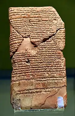 The biblical Book of Ezekiel describes Tyre in 571 BC as if it had been recently captured by the Babylonian army.[64] The supposed length of the siege, 13 years,[65] is only given by Flavius Josephus, and is subject to debate among modern scholars.[62] Josephus's account of Nebuchadnezzar's reign is obviously not entirely historic, as he describes Nebuchadnezzar as, five years after the destruction of Jerusalem, invading Egypt, capturing the Pharaoh and appointing another Pharaoh in his place.[59] A stele from Tahpanhes uncovered in 2011 records that Nebuchadnezzar attempted to invade Egypt in 582 BC, although Apries' forces managed to repel the invasion.[66]