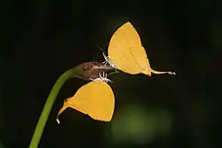 Loxura atymnus butterflies and yellow crazy ants consuming nectar secreted from the extrafloral nectaries of a Spathoglottis plicata bud