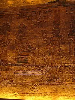 Nefertari appears twice as one of the royal women represented beside the colossal statues of Ramesses II that stand before the temple. To the left of the doorway, Nefertari, Queen-Mother Tuya and the king's son Amun-her-khepeshef (still called Amunhirwenemef here) flank the colossal statue of the king. To the right of the doorway Nefertari, Baketmut and the king's son Ramesses are shown with the Pharaoh.[14]