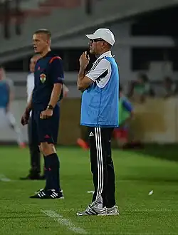 A third consecutive Premier League title followed in 2012–13.[40] Neftçi then won the Azerbaijan Cup on 28 May 2013 to secure the domestic double.[41][42] Following Neftçi's early exit from European cups, Boyukagha Hajiyev resigned from his post.[43][44] Following defeat at 2013 Azerbaijan Supercup, Nazim Suleymanov was appointed as Neftçi's new manager after Tarlan Ahmadov was sacked just three months in charge.[45] On 8 January 2014, Suleymanov resigned as manager after a transfer fund dispute.[46][47] In May 2014, despite finishing fourth, Neftçi managed to win Azerbaijan Cup.[48] In August 2014, the club reached Europa League play-off round after defeating Chikhura Sachkhere on aggregate.[49]