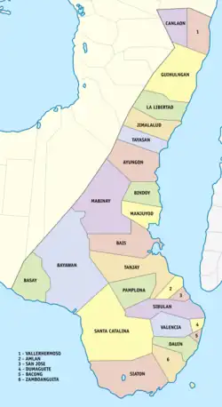 Negros Oriental comprises 19 municipalities and 6 cities, further subdivided into 557 barangays.