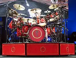 Peart played Zildjian A-series cymbals and Wuhan china cymbals until the early 2000s, when he switched to Paragon, a line created for him by Sabian.[62][64] In concert starting in 1984 on the Grace Under Pressure Tour, Peart used an elaborate 360-degree drum kit that would rotate as he played different sections of the kit.[65]