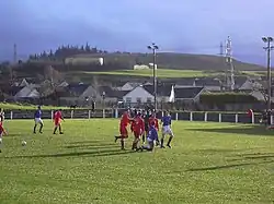 Neilston F.C. is a football club playing in the West of Scotland Football League (established in 2020 - previously the club operated within the Scottish Junior Football Association since their establishment).[58] Formed in 1945, they operate from the Brig O' Lea Stadium in Neilston and play in red and white kits. Their nickname is 'The Farmer's Boys',[59] and their anthem is the folk song, A Farmer's Boy.