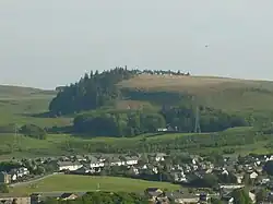 The topography of the areas around Neilston are varied. To the east, the land is relatively flat, but to the south and west it is steeper, rising to heights of 400–900 ft (122–274 m) above the level of the River Clyde.[28] The highest points in the surrounding areas are Neilston Pad and the Corkendale-law, at about 853 and 900 ft (260 and 274 m) above sea level, respectively.[28] Neilston Pad is characterised by a craggy face on its eastern side.[29] Between these hills is the valley of the River Levern. In this valley is the A736 to Barrhead.[28] The soil in the eastern parts of Neilston is a dry loam, occasionally intermixed with gravel. The soil in the hills near Neilston is considered to be largely infertile, whilst to the south and southwest there is an expansive moorland which extends as far as Darvel and Strathaven.[28] The local geology is represented by basalt.[30] The surrounding landscape is dominated by Duncarnock, the resistant core of an ancient and long extinct volcano, known locally as 'the Craigie'.[15]