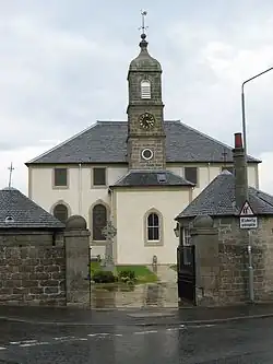 A chapel at Neilston was first recorded in 1163 in a charter of Paisley Abbey. It was commissioned by Sir Robert Croc, as part of a feudal requirement by the High Steward of Scotland, Walter fitz Alan.[37] The original Neilston Kirk was one storey high, and was rebuilt in 1762 to accommodate the growing population of the parish. The only remaining parts of the original building are a Gothic window in a back wall and the burial vault of the Mure family of Caldwell,[37] including the tomb of Laird, scholar and MP for Renfrewshire, William Mure (1799–1860).[30] Between 1796 and 1798 the roof was taken off the church and an additional storey constructed, making space for a gallery to accommodate the growing population of Neilston.[37] The structure has a spire, a clock, and 940 sittings.[30] The old graveyard is centuries old and has a headstone dating from the 15th century.[37] The church is part of the Church of Scotland, and has a Category B listing from Historic Environment Scotland.[47]